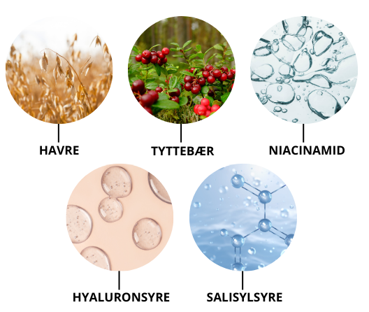 Nøkkelingrediensene er olje fra havre og tyttebær i kombinasjon med hyaluronsyre, som tilfører fuktighet og virker beroligende på huden. Aktive ingredienser som salisylsyre og niacinamid hjelper huden å fornye seg og bidra til en jevnere og mer balansert hudtone.